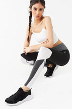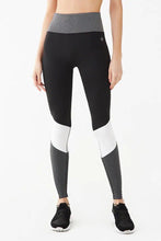 A pair of athletic knit leggings featuring a banded elasticized waist, color and patternblock design, and a high-rise.