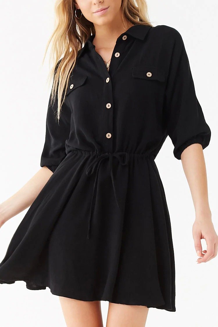 A slub woven mini shirt dress featuring a basic collar, button front, 3/4 dolman sleeves with elasticized cuffs, dual mock chest flap pockets with button accents, a drawstring waist, knit lining, and a flared skirt.