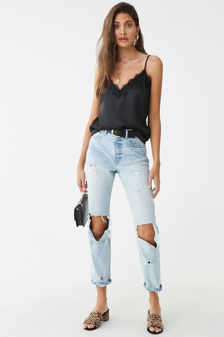A satin top featuring an eyelash lace trim, V-neck, adjustable cami straps, and a relaxed hem.