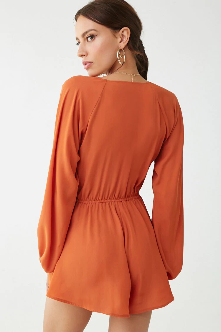 A woven romper featuring a surplice neckline, long raglan balloon peasant sleeves, elasticized waist with tasseled self-tie front detail, and relaxed silhouette.